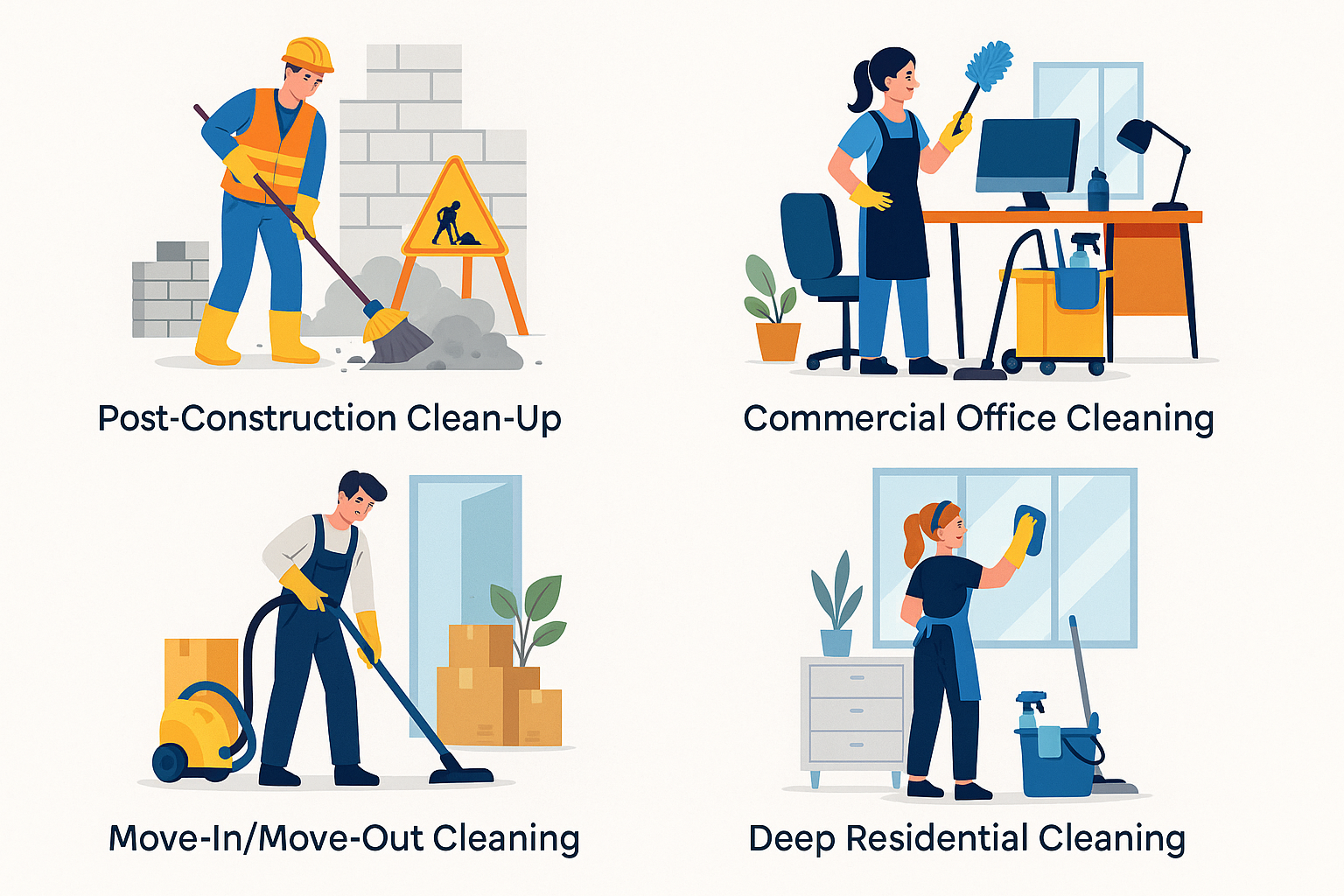 Our team specializes in post-construction clean-up, commercial office maintenance, move-in/move-out services, and deep residential cleaning that doesn't just shine—it disinfects.